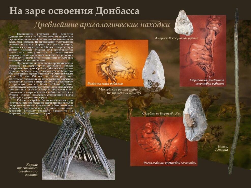 Виртуальная выставка «Археология Донецкого края в музейном собрании» представляет собой версию стационарных археологических экспозиций и охватывает хронологический диапазон: от 150 тысяч лет от нашего времени до ХIV в. нашей эры. Среди экспонатов – Амвросиевское рубило, керамические сосуды, предметы вооружения, аксессуары скифского воина и другие.