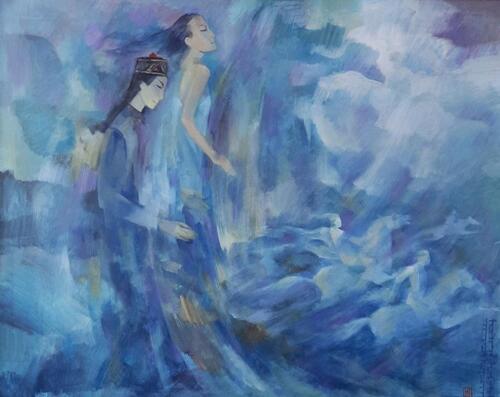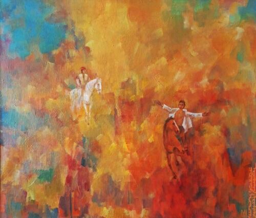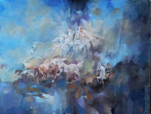 «Моя степь» и «Навстречу ветру» передают ощущение свободы, простора, «растворённости» человека в природе. Художник акцентирует идею движения. Конь здесь — воплощение полёта, свободы, а степь — бескрайнее пространство, место, где рождаются мифы и герои, где соединяются небесное и земное, прошлое и настоящее. Она предстает как вместилище смыслов, метафора вечного пути, непрерывного движения. Это не просто географическое пространство, но особое состояние бытия, в котором исчезают границы между телесным и духовным — проекция внутреннего мира художника, его размышлений о человеке, времени, традиции. Здесь пейзаж приобретает черты космоса, где всё связано: ритм линий, энергия цвета, движение света. Кочевник для Шиняева — не просто странник, но носитель памяти, духа и культуры, через которого автор утверждает идею преемственности, устойчивости в изменчивом мире. В этом созерцательном, медитативном движении формируется образ степи как символа пути — между мирами и эпохами.