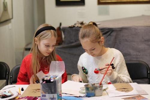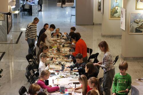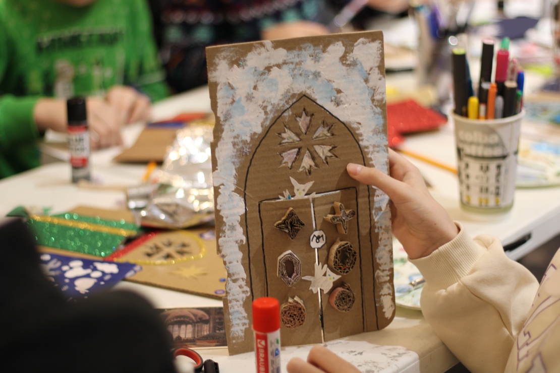 В декабре, по традиции, устраиваем фабрику новогодних подарков! Предлагаем поискать на выставке зимние пейзажи и вглядеться в картину Ксении Истоминой «У входа в храм». По мотивам этой работы мы придумаем объёмную композицию с волшебной дверью! И пора приманить лошадку – предлагаем сделать ёлочные гирлянды и игрушки с символом наступающего года!