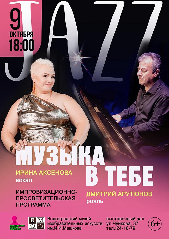 9 октября в 18:00 в выставочным зале музея Машкова (ул.Чуйкова, 37) известные волгоградские музыканты Дмитрий Арутюнов (рояль) и Ирина Аксёнова (вокал) представят премьерную импровизационно-просветительскую программу «Музыка в тебе». Популярные исполнители часто выступают в пространстве музея Машкова и каждый их концерт проходит с неизменным зрительским успехом!