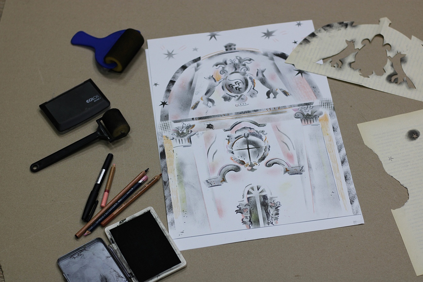 На мастер-классе предлагаем сделать свою композицию в технике трафаретной печати, используя силуэты архитектурных деталей Строгановского дворца. Мы поучимся работать пятном (трафарет) и линией (дорисовка мелких элементов линером).