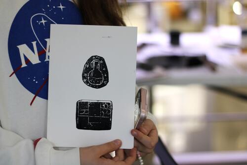 На мастер-классе делаем зарисовки предметов того периода, рисуем инструменты мастера и всякие склянки для хранения драгоценных пигментов. Затем, эти рисунки переносим на тетрапак и печатаем гравюр! Мы будем использовать типографскую краску, а вот само изображение попробуем напечатать с помощью печатного станка и с помощью обычной ложки!