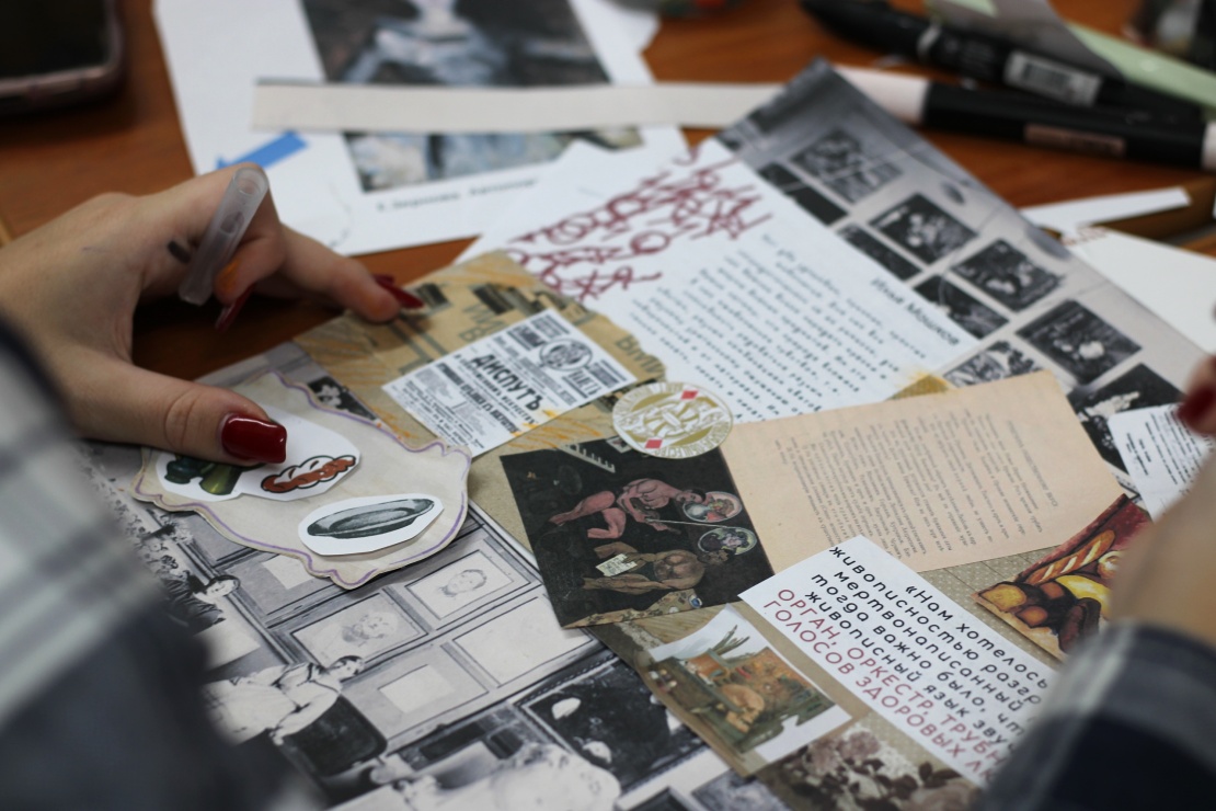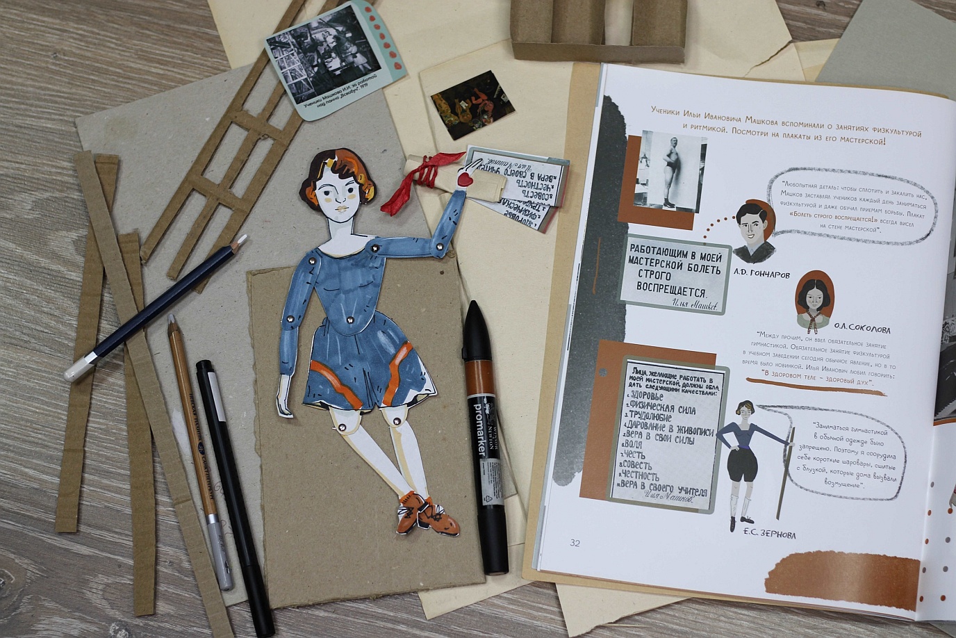 На занятии мы предлагаем посмотреть на фотографии мастерской Машкова и вспомнить знаковые произведения, висевшие на стенах. Затем мы поработаем с текстами учеников Машкова, сделаем зарисовки и сделаем куклу-марионетку в виде студийца. Будем работать с картоном и бумагой разной фактуры, использовать фломастеры, маркеры, подвижные детали скрепляем специальными заклёпками – брадсами. Также ребятам будет предоставлен раздаточный материал, в виде страниц из новой интерактивной тетради и репродукции плакатов из мастерской Машкова.