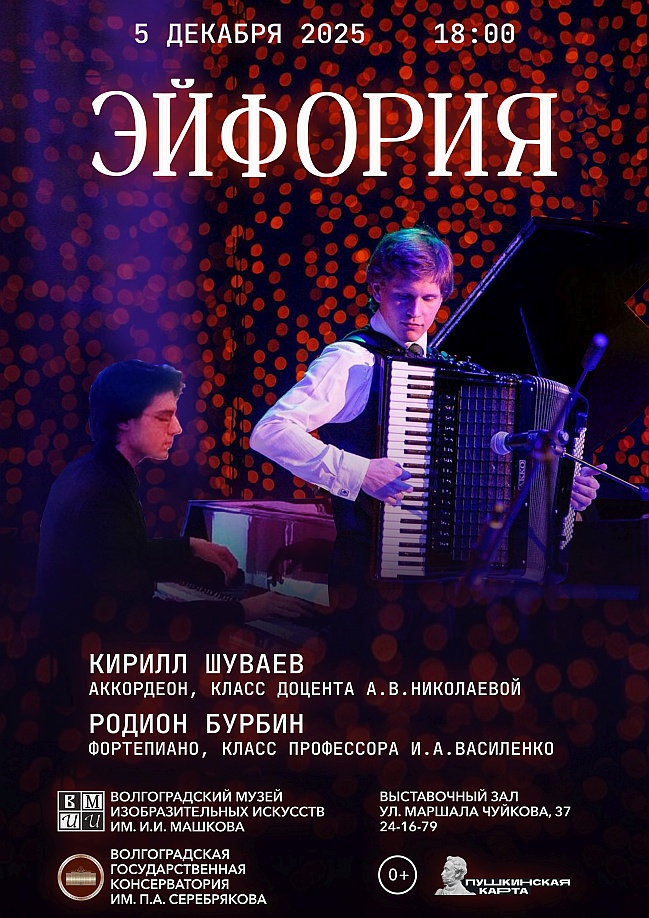 5 декабря в 18:00 в выставочном зале музея Машкова (ул.Чуйкова, 37) состоится концерт «Эйфория», который станет настоящим музыкальным путешествием во времени для зрителей всех поколений. Этот музыкальный вечер — совместное мероприятие Волгоградского музея изобразительных искусств им. И. И. Машкова и Волгоградской государственной консерватории им. П.А.Серебрякова, который предполагает синтез разных видов искусств — музыки и живописи.