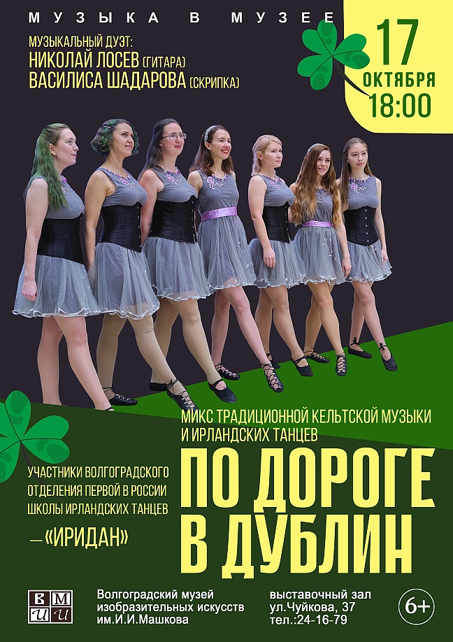 17 октября в 18:00 в выставочном зале музея Машкова (ул. Чуйкова, 37) состоится премьера концертной программы «По дороге в Дублин», которая посредством музыки и танцев погрузит зрителей в атмосферу таинственной и красивой кельтской культуры. В концерте выступят участники волгоградского отделения первой в России школы ирландских танцев — «Иридан», занимавшие призовые места в российских и международных конкурсах. Танцоры будут выступать под аккомпанемент «живой музыки» — музыкального дуэта Николая Лосева (гитара) и Василисы Шадаровой (скрипка), который исполнит традиционную ирландскую музыку.