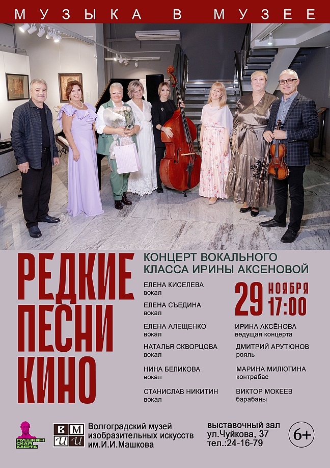 Предстоящий концерт «Редкие песни кино» состоится в рамках музейного проекта «Музыка в музее», который предполагает посещение не только мероприятия, но и всех экспозиций, действующих в это время в выставочном зале. Музыкальный вечер пройдет в пространстве масштабной выставки художников-живописцев из Санкт-Петербурга, выпускников Санкт-Петербургской Академии художеств им. И. Е. Репина — «Отражения».