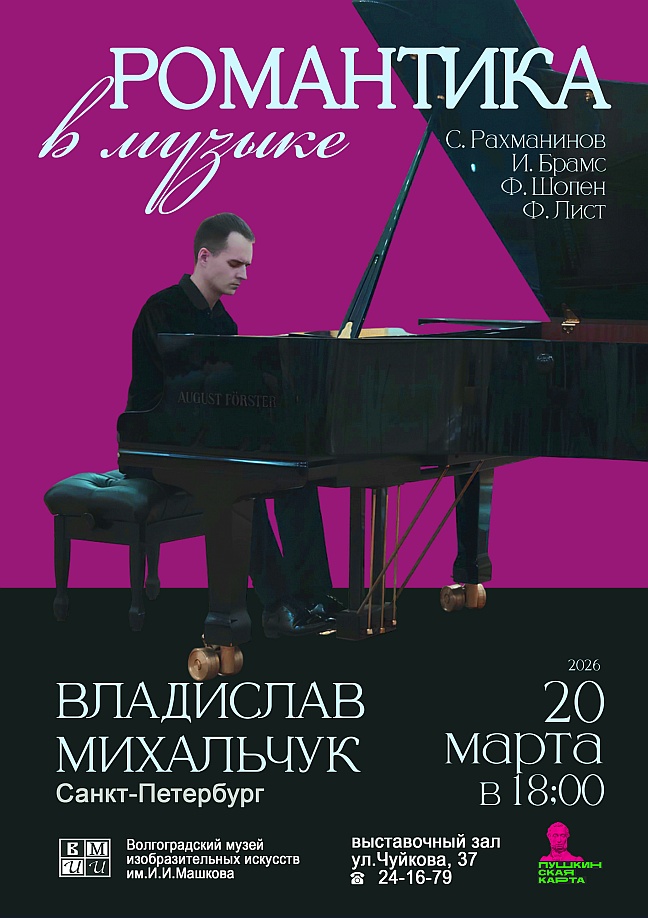 20 марта в 18:00 ВПЕРВЫЕ в выставочном зале музея Машкова (ул. Чуйкова, 37) состоится концерт, который исполнит известный классический пианист из Санкт-Петербурга Владислав Михальчук. Музыкант представит концерт «Романтика в музыке», состоящий из жемчужин фортепианного классического наследия. Виртуоз исполнит музыкальные шедевры Рахманинова, Листа, Шопена и Брамса, мелодии которых составляют ДНК мировой музыкальной культуры.