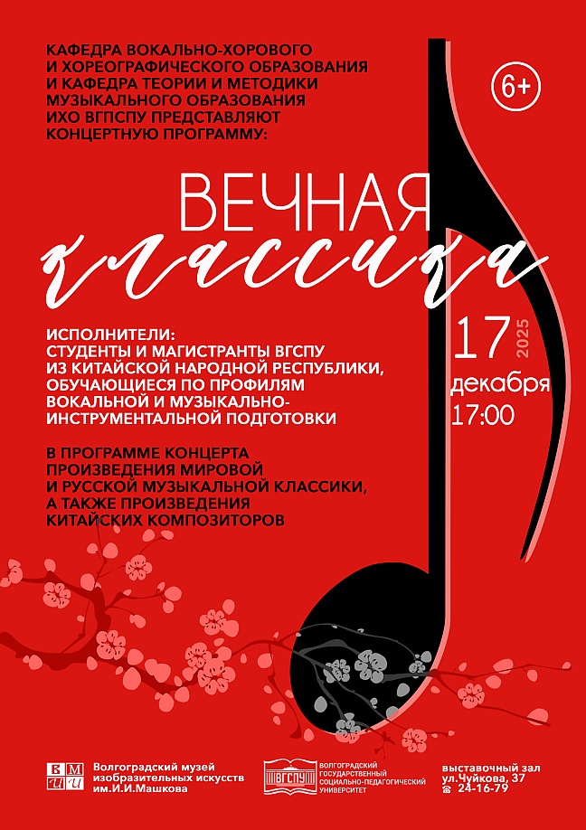 17 декабря в 17:00 в выставочном зале музея Машкова (ул. Чуйкова, 37) состоится уникальный концерт — «Вечная классика», в котором выступят студенты и магистранты из Китайской народной республики, обучающиеся по профилям вокальной и музыкально-инструментальной подготовки. Концертную программу представит кафедра вокально-хорового и хореографического образования и кафедра теории и методики музыкального образования Института художественного образования Волгоградского государственного социально-педагогического университета.