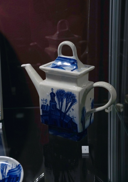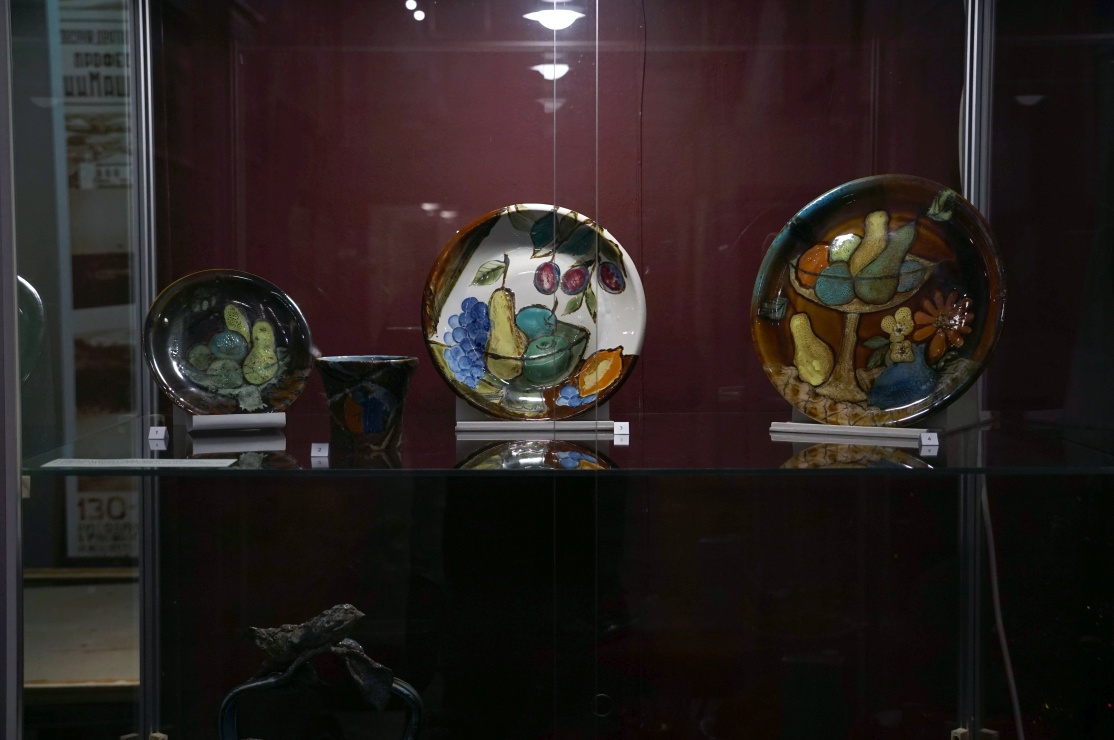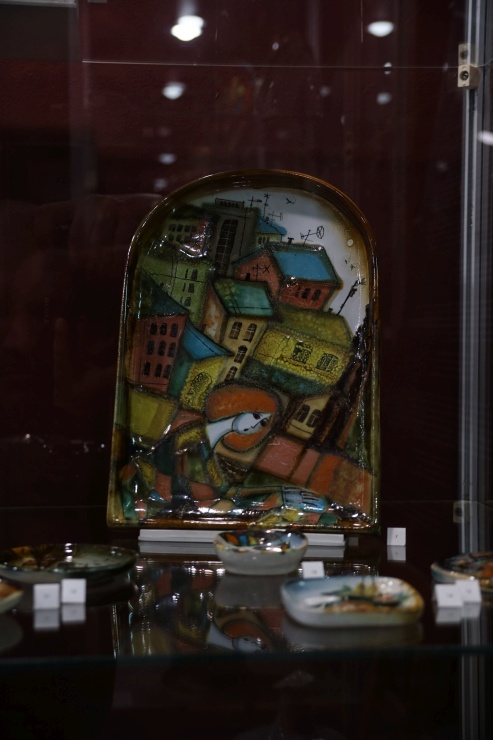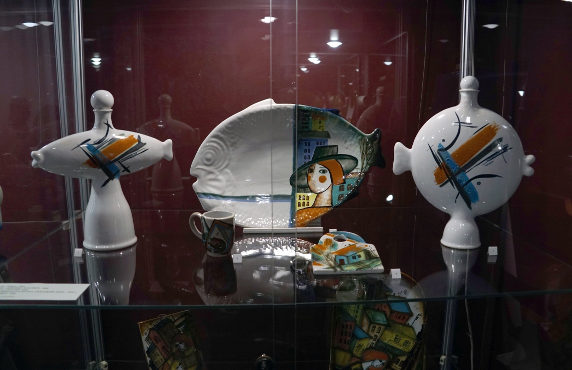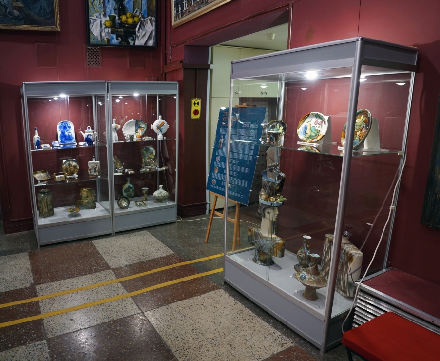 На выставке представлено более тридцати произведений 1980-х – 2000-х годов: декоративные тарелки и пласты, вазы, блюда, кружки и художественные сувениры с узнаваемыми «тяпинскими» мотивами городского пейзажа, пасторальных деревенских храмов, «таких внезапных», несегодняшних дам и барышень, вкусных южных натюрмортов с грушами, сливами и виноградом.