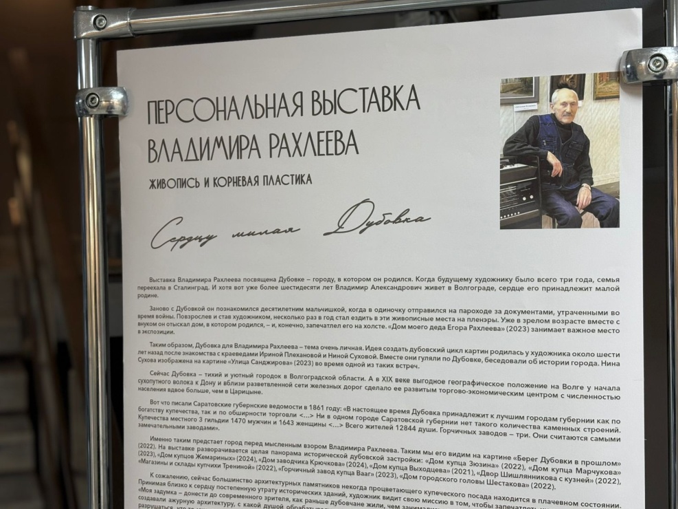 Выставка Владимира Рахлеева посвящена Дубовке — городу, в котором он родился. Когда будущему художнику было всего три года, семья переехала в Сталинград. И хотя вот уже более шестидесяти лет Владимир Александрович живет в Волгограде, сердце его принадлежит малой родине.