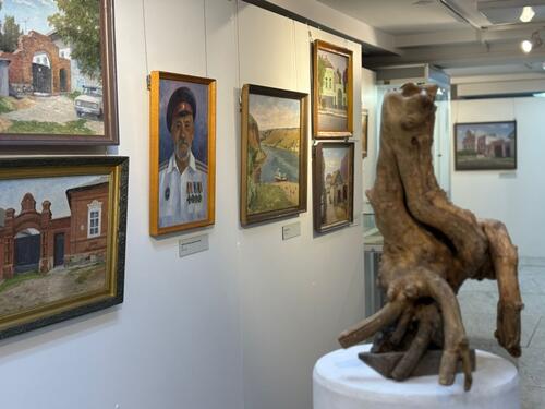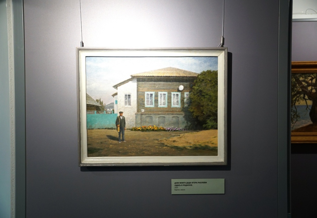 Заново с Дубовкой он познакомился десятилетним мальчишкой, когда в одиночку отправился на пароходе за документами, утраченными во время войны. Повзрослев и став художником, несколько раз в год стал ездить в эти живописные места на пленэры. Уже в зрелом возрасте вместе с внуком он отыскал дом, в котором родился, — и, конечно, запечатлел его на холсте. «Дом моего деда Егора Рахлеева» (2023) занимает важное место в экспозиции.