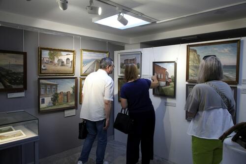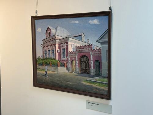 Именно таким предстает город перед мысленным взором Владимира Рахлеева. Таким мы его видим на картине «Берег Дубовки в прошлом» (2022). На выставке разворачивается целая панорама исторической дубовской застройки: «Дом купца Зюзина» (2022), «Дом купца Марчукова» (2023), «Дом купцов Жемариных» (2024), «Дом заводчика Крючкова» (2024), «Дом купца Выходцева» (2021), «Двор Шишлянникова с кузней» (2022), «Магазины и склады купчихи Трениной» (2022), «Горчичный завод купца Вааг» (2023), «Дом городского головы Шестакова» (2022).