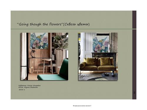 Коллекция, представленная на выставке, создавалась для персонализации помещений в современном интерьере. Этим обусловлена техника выполнения рисунка. Задачей автора было создать картины, способные превратить лаконичный интерьер в живое дышащие пространство. Художница желает в канун Нового года сделать подарок родным, друзьям, посетителям: скрасить тусклые, пасмурные дни ярким многоцветием, вызвать приятные воспоминания о солнце и тепле, которых так не хватает в это время.