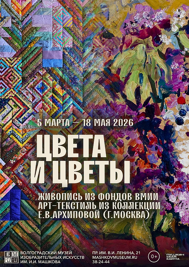 Экспозиция «ЦВЕТА И ЦВЕТЫ» воплощает в жизнь эксперимент, в рамках которого единое цветовое и цветочное пространство образовано живописными произведениями из Фондов ВМИИ им.И.И. Машкова и работами из коллекции лоскутного шитья и арт-текстиля Екатерины Владимировны Архиповой (г.Москва).