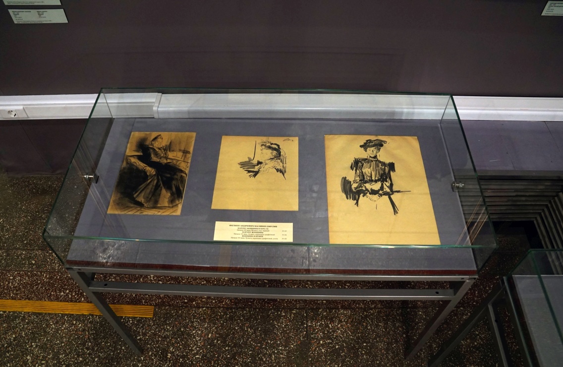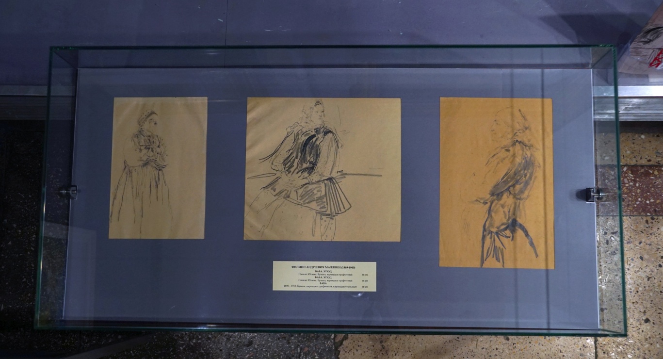 Малявину было важно уловить настроение каждой своей модели. Это заметно и в рисунках на выставке. Задумчив взгляд сидящей женщины в корсетке, надетой поверх рубахи; молодая крестьянка с рядами бус на шее смотрит сверху вниз с лукавым прищуром. Чувствуется спокойная уверенность в профиле крепкой женщины со скрещенными поверх передника-занавески руками. Улыбаются светские дамы в модных шляпках: одна широко, задорно, другая мечтательно, глядя вдаль. Художник одинаково внимателен и к деталям народного костюма, намечая его узоры даже в карандашном эскизе, и к дамскому платью, подчеркивая его утонченность и изящество.