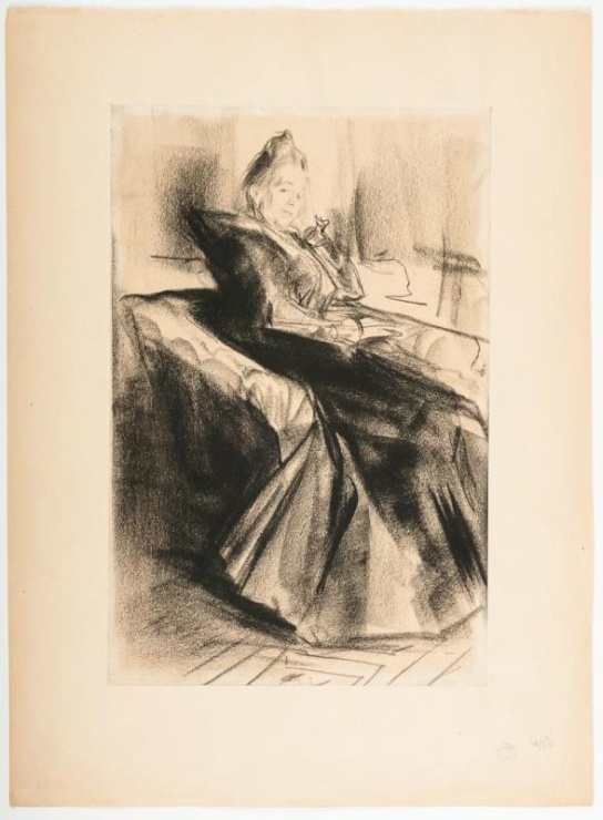 Филипп Малявин известен прежде всего своими бойкими и темпераментными крестьянками — «девками» и «бабами», как называли их современники. Однако он изображал и представителей светского общества, интеллигентской среды. Графический «Портрет женщины в кресле» из собрания ВМИИ, очевидно, является эскизом к живописному «Портрету г-жи Поповой» (1899, Государственный Русский музей). Интересно, что и в рисунке, и в живописи художник добился схожего драматичного звучания благодаря глубоким черным теням.