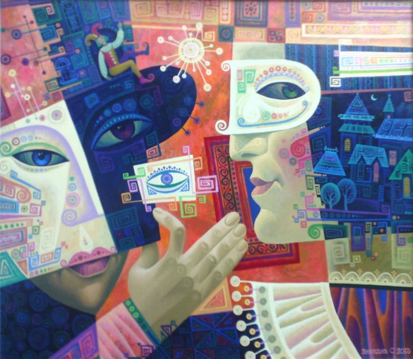 Иллюстрируя мысли. В реальности Сергея Лебедева сходятся смешное и трогательное, лирическое и символическое, и человек предстает как существо историческое, попадающее в ситуации, которые остается освоить как собственные. Художник исходит из того, что нам дан как мир вещей, так и мир людей. Живописное полотно – это всегда открытие соотнесенности миров. И тогда созидается новая реальность, в которой обитают феи, вещие птицы, пульсирует жизнь как балансирование канатоходца, воздушность женских образов и узорчатая насыщенность мира. Возникает мир, воздух которого соткан осмысленными цветами и оттенками, наполнен движением-повествованием и украшен вплоть до каждого самого маленького фрагмента большой мозаики. Одновременно Лебедев полностью соблюдает принцип связи с жизнью, только жизнь течет перед нами как бы на театральном возвышении.