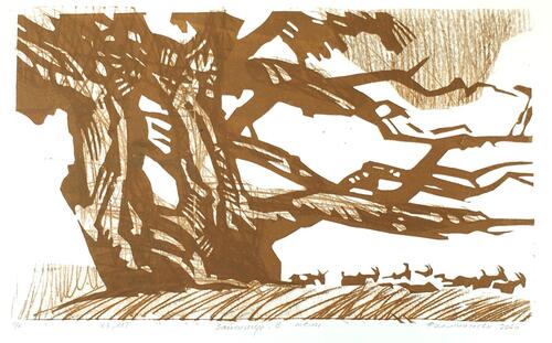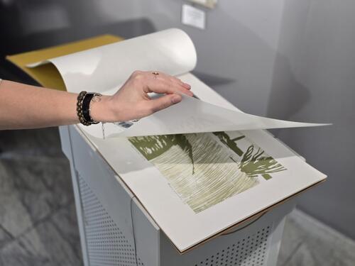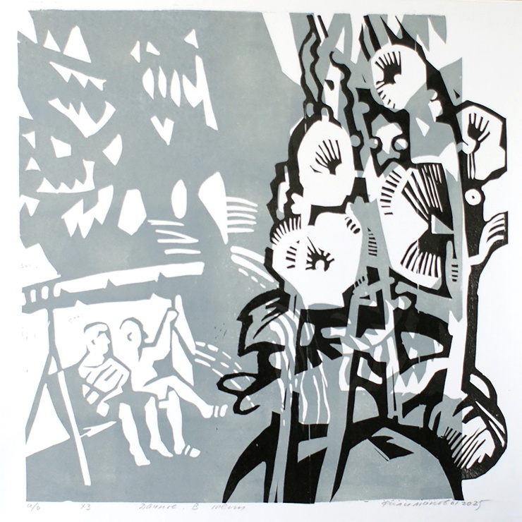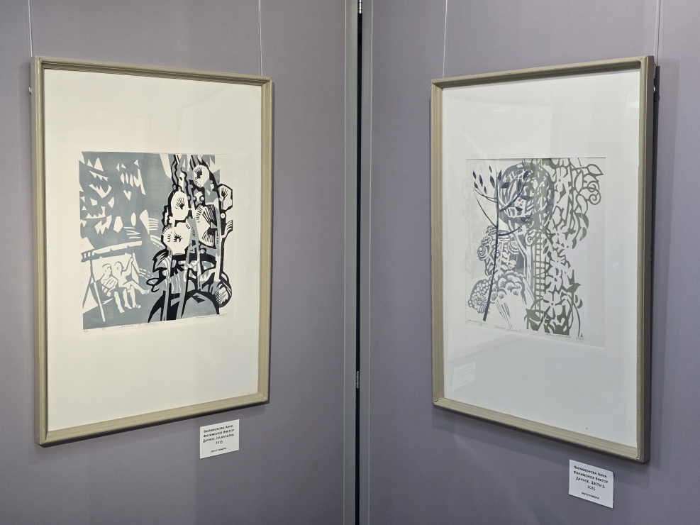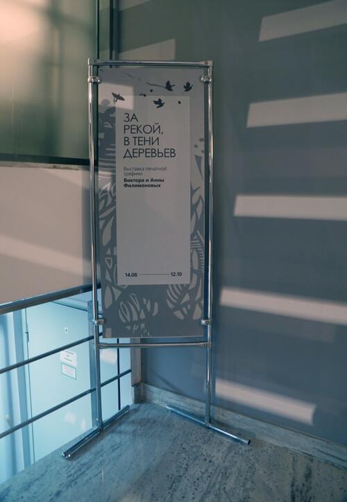 Выставка «За рекой, в тени деревьев» объединила две графические серии — «Займище» (2024) и «Дачное» (2025), созданные известными волжскими художниками Анной и Виктором Филимоновыми. Представленные в экспозиции произведения — результат работы двух авторов, отца и дочери. С 2009 года мастера, такие разные по темпераменту, но близкие по глубине художественного мышления, работают совместно, создавая серии и циклы, в которых личное переживание, эмоциональная отзывчивость, формальные и пластические поиски объединяются в цельную художественную практику. Они обсуждают, спорят, экспериментируют, размышляют о выразительных возможностях техник, о современности и задачах творца, о природе и человеке.