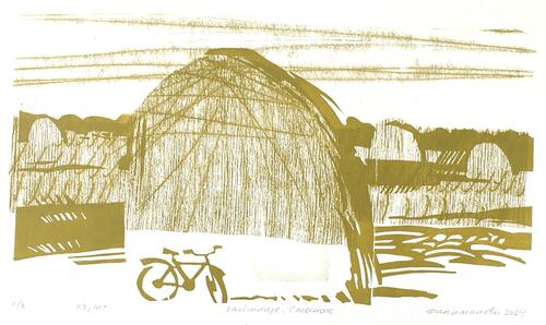 Серия «Займище» посвящена Средне-Ахтубинской пойме — месту, значимому для обоих авторов. Это пейзажи, знакомые с детства, наделённые особыми чувственными и ассоциативными характеристиками, наполненные воспоминаниями, звуками, запахами и внутренним ритмом, который невозможно спутать ни с чем. Графические листы представляют собой не просто воспроизведение ландшафта, но размышление о сложности восприятия окружающей нас действительности, о сопряжении личного и вселенского. Это одновременно любование особенностями уникальной поймы, прогулка по знакомым местам и философское размышление о месте человека в мире. Так в пространстве бескрайней степи узнаётся «домик, точно, как у дядьки», среди могучих дубов, заводей с кувшинками и полей можно увидеть велосипеды — воспоминание о поездках на рыбалку и остановках в стогах, а вид на залив отсылает к истории о потерянном из-за поднявшейся воды вентере. Натурные образы порой стремятся к абстракции: пейзажные мотивы обобщаются и превращаются в некие универсальные символы природных стихий.